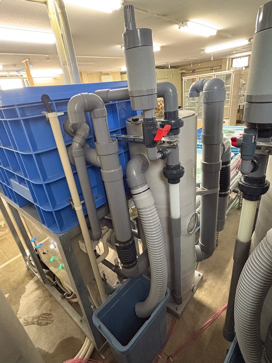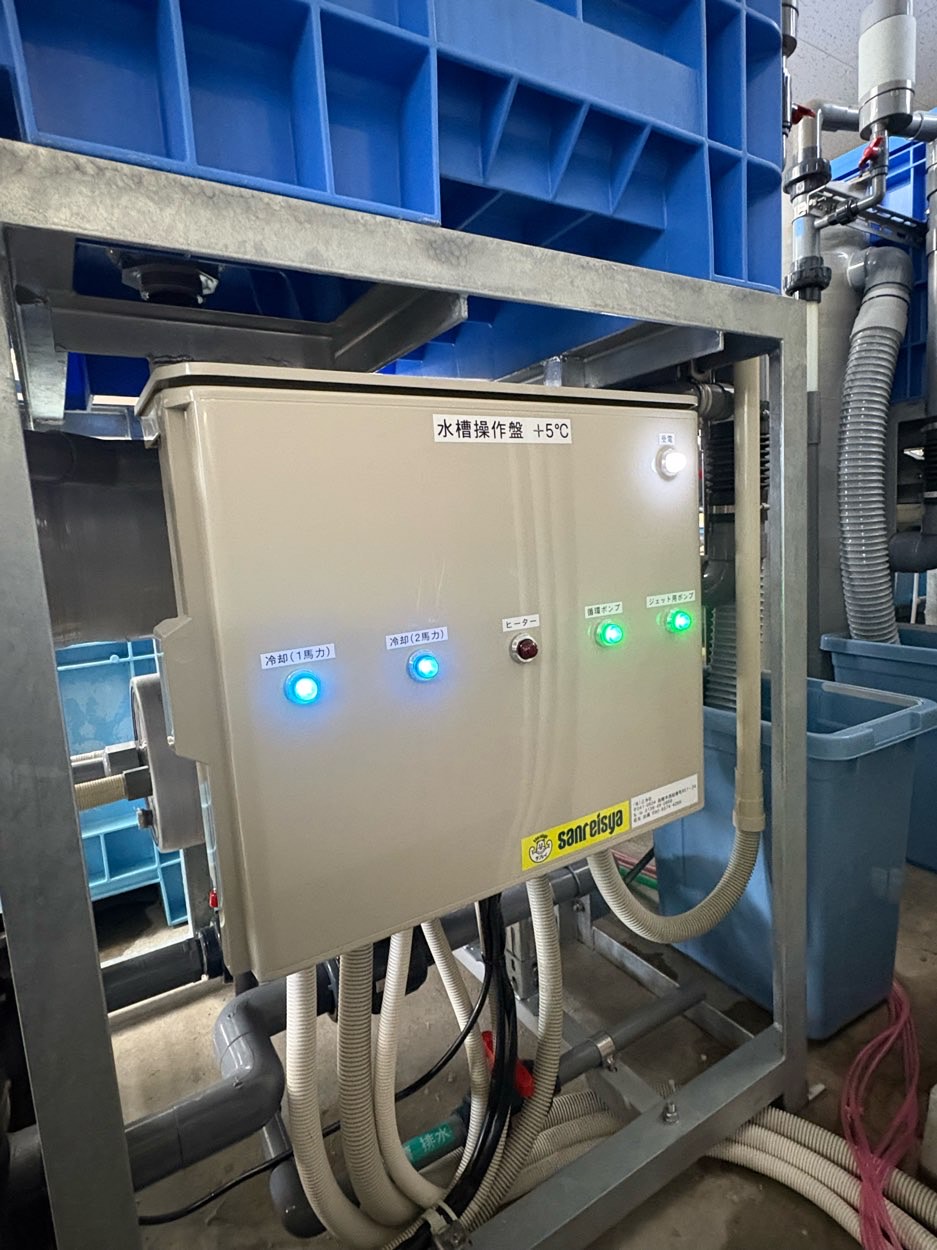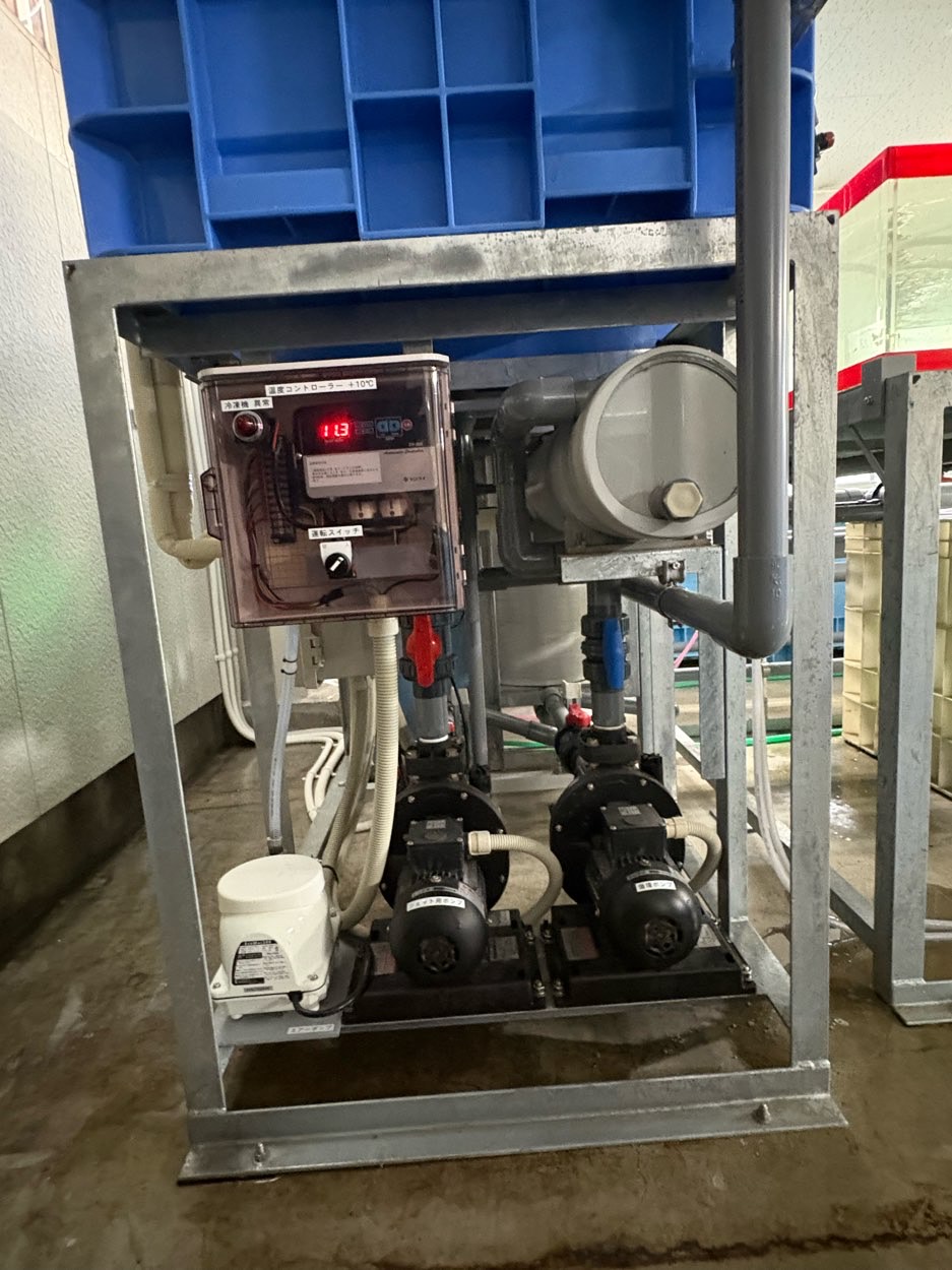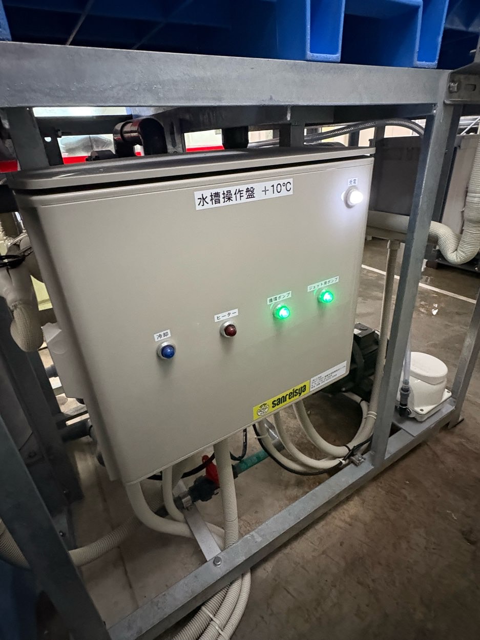 ジャンボックスはお客様からの支給で、冷却機・循環ポンプ・エアーポンプ・泡沫分離槽・操作盤など弊社の中古品を使いながら、+10℃仕様と+5℃仕様の2セット製作いたしました。